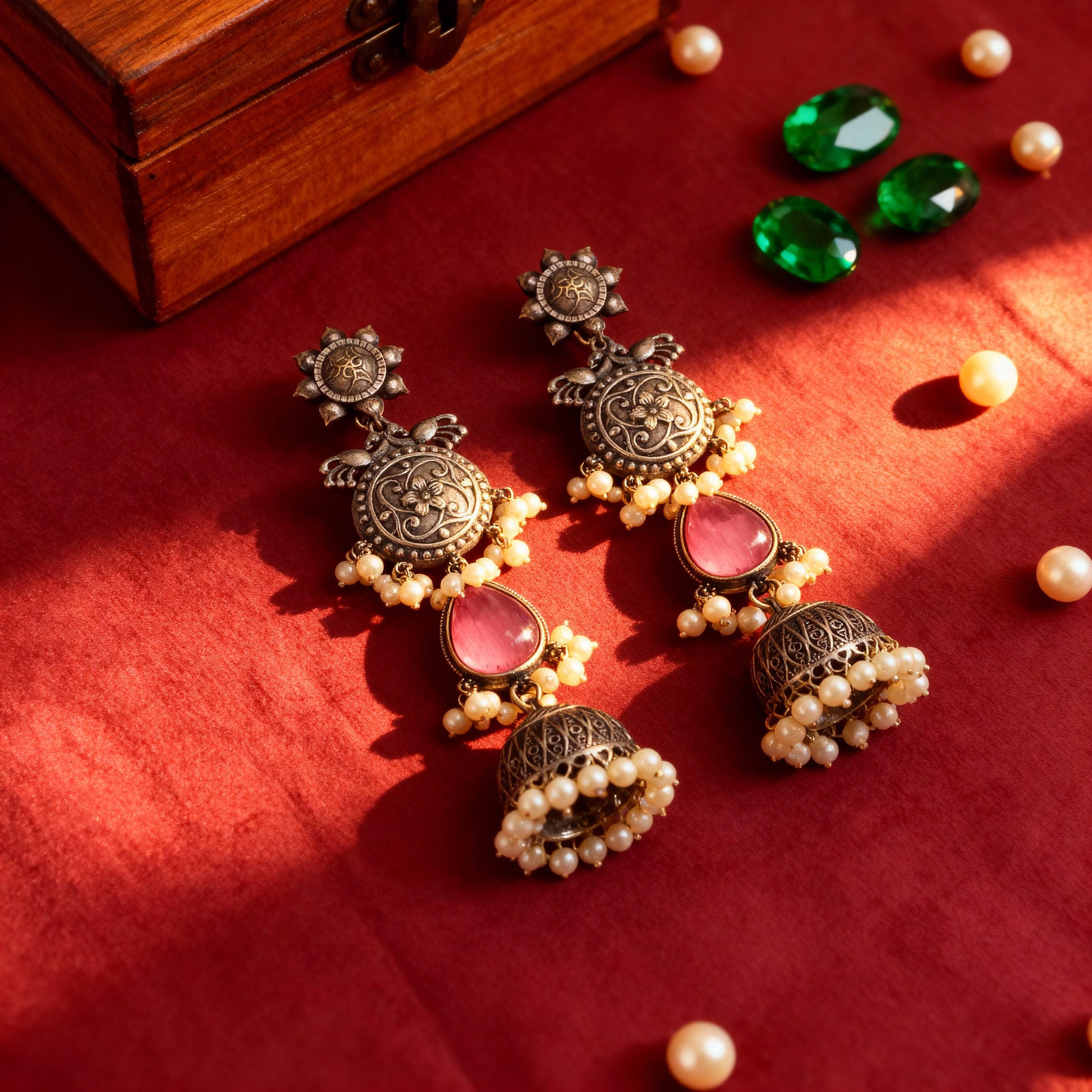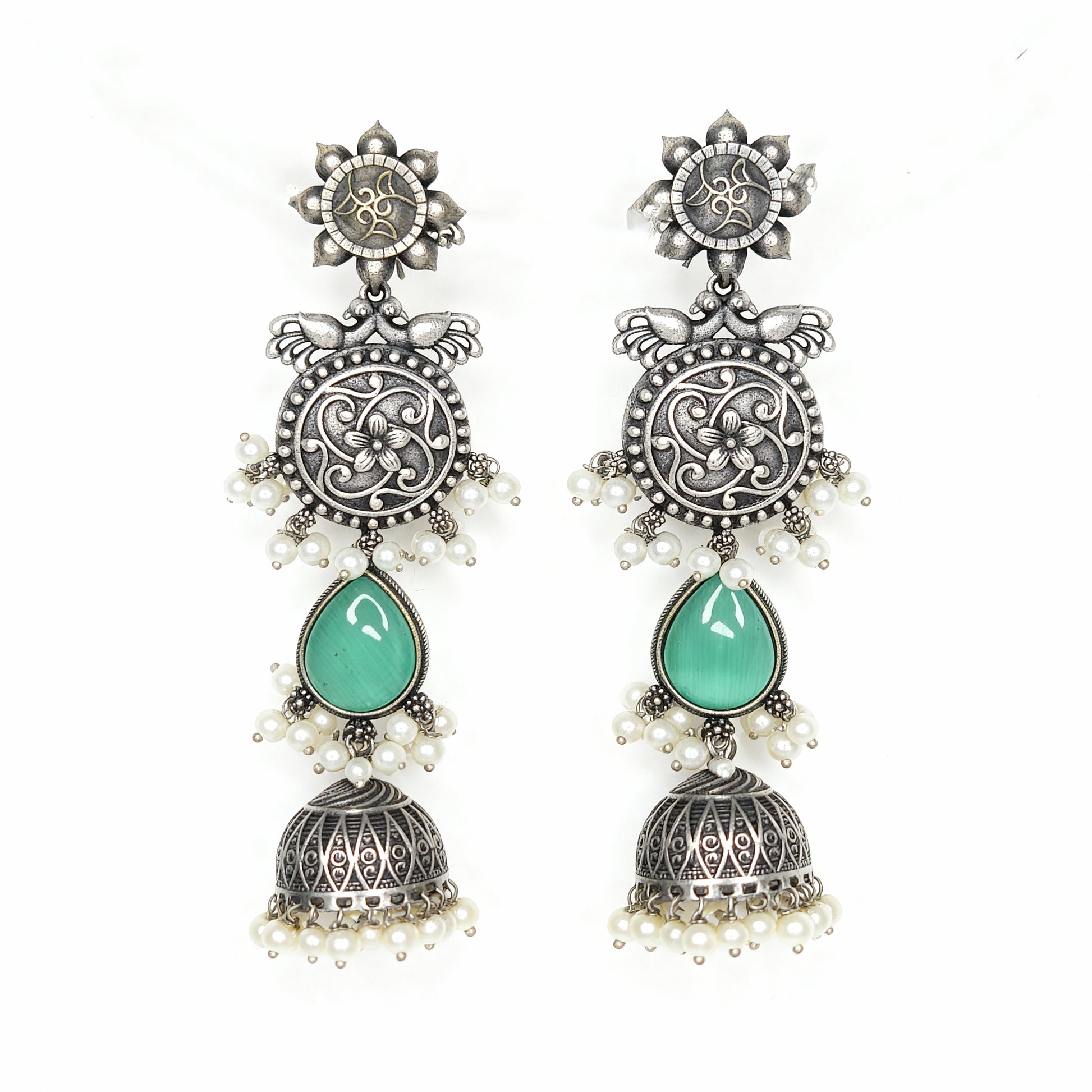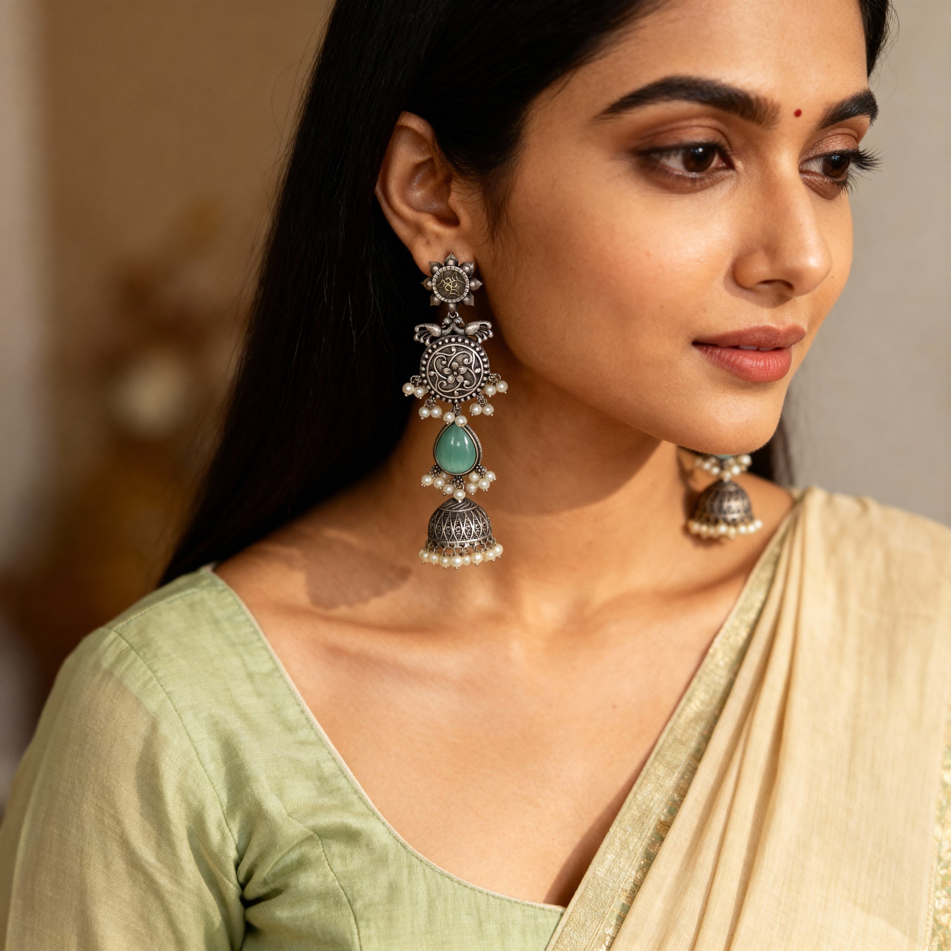 Each handcrafted oxidised silver jhumka reflects fine Indian artistry, adorned with intricate carvings and subtle shimmer. The soothing mint green hues paired with soft pearl drops make these earrings perfect for both festive celebrations and everyday ethnic wear.