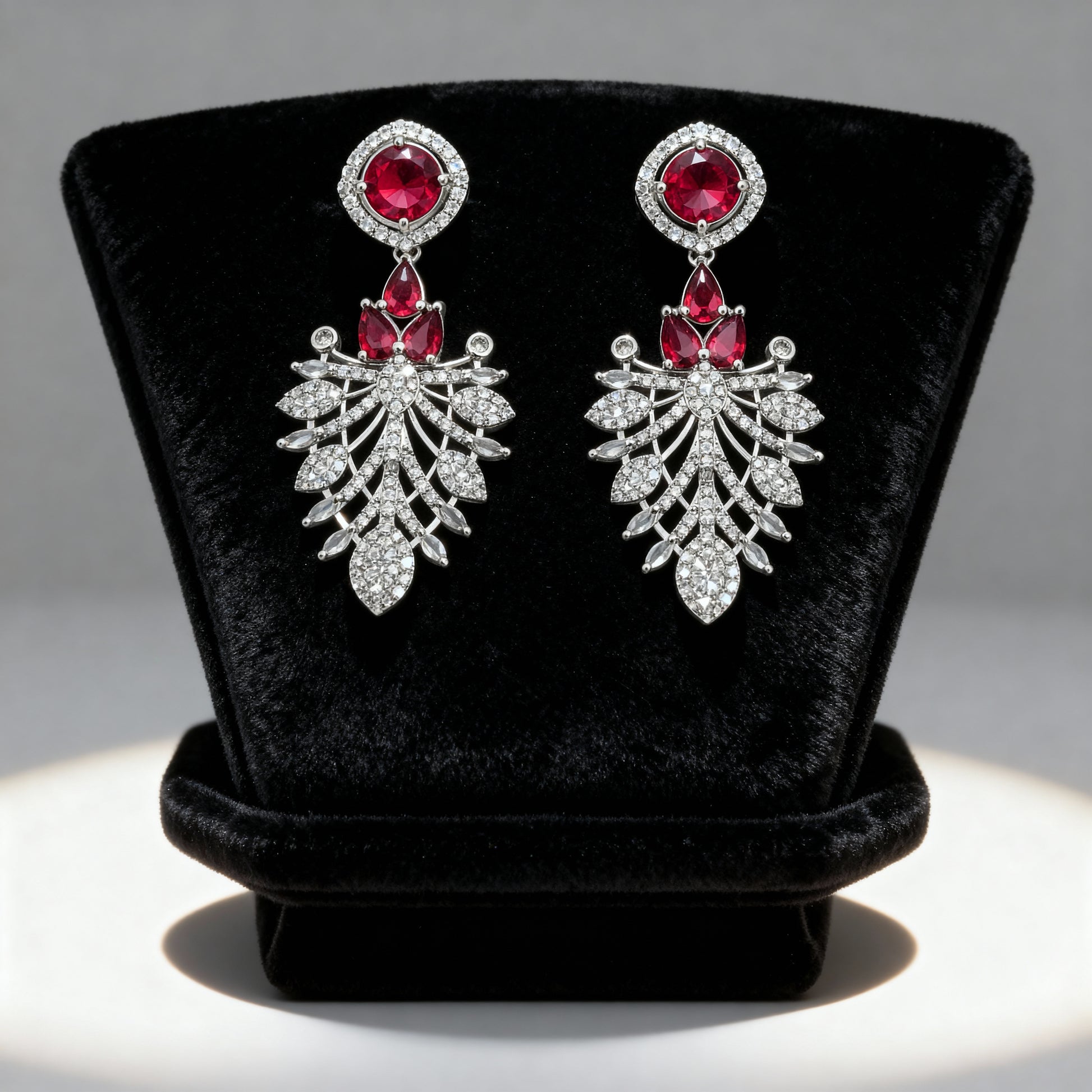 Add a dash of glamour to your look with the Tantaaz Silver-Toned American Diamond Earrings, exquisitely designed in a graceful leaf-shaped drop pattern. Adorned with sparkling white American Diamonds and a vibrant red stone accent, these earrings radiate timeless elegance with a modern touch.